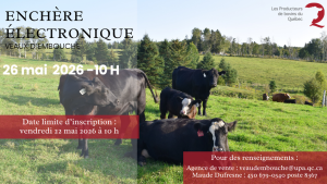 La prochaine vente aux enchères électronique est prévue le 26 mai 2026. Les producteurs souhaitant inscrire leurs veaux doivent le faire avant 10 h, le vendredi 22 mai. Toutes les informations nécessaires, y compris les conditions de vente et d’achat, le formulaire d’inscription et l’accès à la plateforme d’enchères électroniques, sont disponibles ICI.